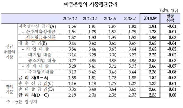 예금은행의 저축성 수신 금리는 0.01%포인트 하락한 1.81%를 기록했다.