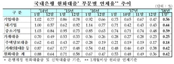 금융감독원은 12일 국내은행의 1월말 원화대출 연체율이 0.42%로 전월의 0.36%보다 0.06%포인트 상승했다고 밝혔다.