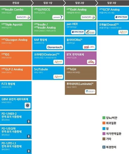 이번에 공개된 한미약품의 23개 파이프라인은 바이오신약 14개·합성신약 9개로 구성됐으며, 전임상 단계에 있는 신규 후보물질 9개가 추가됐다. 신규 후보물질에는 바이오신약의 약효를 늘려주는 플랫폼 기술 '랩스커버리'가 적용된 희귀질환 치료제와 북경한미약품이 개발한 플랫폼 기술 '펜탐바디'가 적용된 면역표적항암 이중항체 프로젝트 등이 포함됐다. 또 오픈이노베이션 전략의 일환으로 아주대학교 연구진과 공동개발 중인 줄기세포를 활용한 항암신약 파이프라인도 신규 등재했다.
