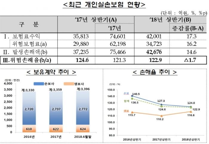 보험사의 지급 준비금과 계약자에게 준 보험금 등 발생 손해액이 19.1%나 늘어난 여파다. 반면 손해보험사는 보험 계약 갱신에 따른 보험료 인상으로 손해율이 1년 전보다 3.3%포인트 내린 124%에 머물렀다.