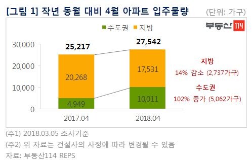 수도권은 지난해 1분기 입주물량(3만173가구)보다 올해 1분기 입주물량이 86%(2만5809가구) 가량 증가한 5만5982가구가 입주한다. 수도권 일부 지역에 가격약세가 지속되는 상황에서 1분기 입주물량에 이어 4월 입주물량이 크게 증가하면서 공급부담이 가중될 것으로 예상된다.