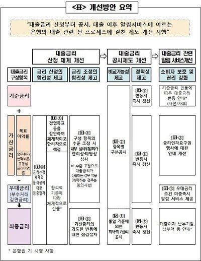 이 밖에 은행 내부통제기준에 '금리산정체계의 합리성에 대한 검증 절차'와 '가산금리의 과도한 변동에 대한 점검 절차'를 추가해 대출금리 산정과 적정성을 수시로 점검하도록 했다. 주택담보대출의 공시 방법도 바꾸기로 했다. 지금은 대출금리를 공시할 때는 최저∼최고 금리만 밝혀왔다. 그러나 앞으로는 기준금리와 가산금리·우대금리·최종금리를 구분해서 공시하도록 했다. 또 대출금리가 바뀌면 즉시 공시하고 우대금리를 받던 고객이 상황이 달라져 우대금리를 받지 못하게 되면 문자메시지 등을 통해 바로 알리도록 했다. 금리 인하 요구권 행사에 대한 안내 서비스도 이메일 발송 등을 통해 추가로 안내하도록 개선했다.
