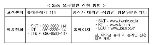 [토요경제=여용준 기자] 통신요금 20% 할인 가입자들은 이번 달 중 이동통신회사 고객센터에 전화 한 통만 하면 누구나 25% 할인을 받을 수 있게 됐다.