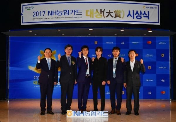 ▲ 15일 서울 용산구 소재 그랜드하얏트호텔에서 개최된 '2017년 NH농협카드대상' 시상식에서 이인기 NH농협카드 사장(왼쪽에서 첫 번째), 이대훈 NH농협은행장(왼쪽에서 두 번째), 배우 유승호씨(오른쪽에서 세 번째)가 수상자들과 기념촬영을 하고 있다.<사진=NH농협은행>