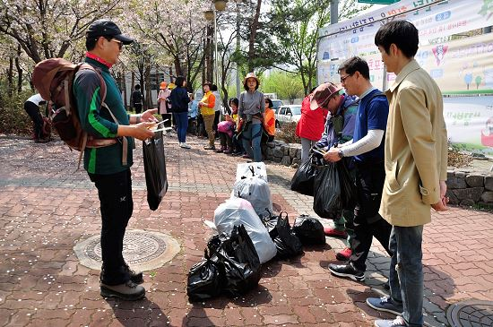 [토요경제=조은지 기자] 지난 15일 서울둘레길 2코스 화랑대역에서 진행한 '크린트레일워킹' 행사에서 참가자들이 다같이 둘레길을 돌며 쓰레기를 줍고 있다.