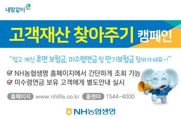 [토요경제=정종진 기자] NH농협생명은 18일 보험계약자가 찾아가지 않은 보험금을 돌려주는 '고객재산 찾아주기 캠페인'을 연중 실시한다고 밝혔다.