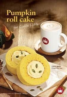 할리스커피 단호박 롤케익은 폭신폭신한 단호박 스펀지케익에 단호박무스를 듬뿍 넣어 만든 롤케익으로 자극적이지 않으면서도 순한 맛이 특징이다.