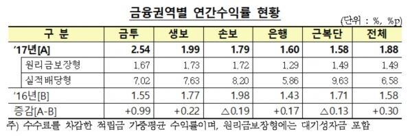 지난해 원리금보장상품의 수익률은 1.49%, 실적배당형상품은 6.58%였다.