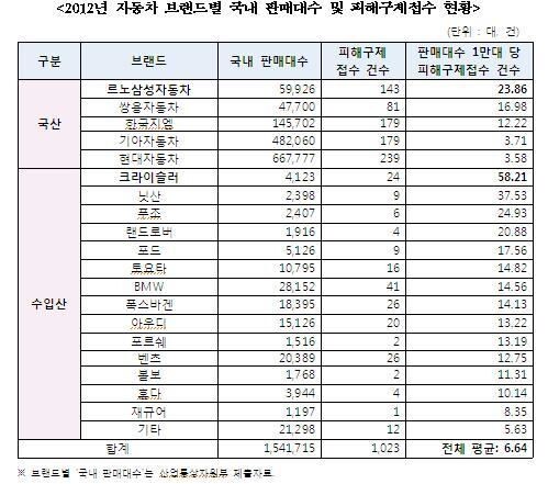 2012년 국내판매량 4위를 차지한 르노삼성의 자동차 판매대수 1만대 당 소비자 피해발생 비율은 23.86건으로 국산차 브랜드 가운데 1위를, 국산·외제차를 통틀어 4위를 기록했다. 르노삼성 다음으로 피해발생율이 높은 국산차 브랜드는 2위 쌍용자동차(16.98건), 3위 한국GM(12.22건)이었다.