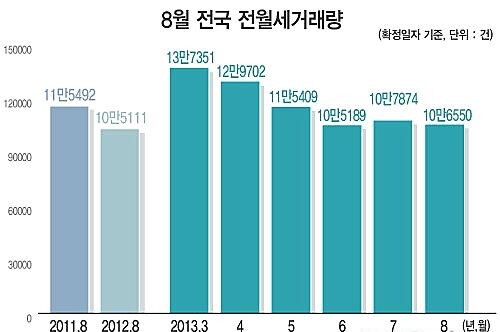 국토교통부가 24일 발표한 ‘8월 전월세 거래 동향 및 실거래가 자료’에 따르면, 지난달 전월세 거래는 전국 10만6000여건으로 집계돼 전년 동월 대비 약 1.4% 증가했다.