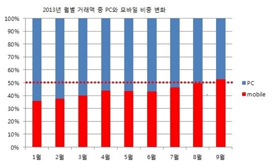 주말이나 주중 연휴가 있는 주의 경우, PC보다 모바일에서의 거래가 일일 또는 주간 단위로 50%를 넘어선 적은 있지만 월간 단위로 모바일이 앞선 것은 쇼핑 업계에서 처음이다.
