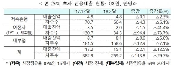 최고금리 인하로 24% 초과 금리를 적용받던 103만4000명의 대출자가 금리 인하 혜택을 받았다. 이에 따라 2월말 현재 24% 초과 금리를 적용받는 대출자는 269만2000명으로 지난해 말보다 30% 감소했다.