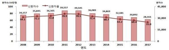 환자 수는 2011년 3만9557명을 기록한 이후 6년 연속 감소했다. 특히 20대 환자가 20% 줄었다.