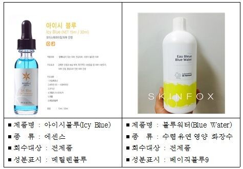 [토요경제=이경화 기자] 식품의약품안전처는 23일 화장품 제조판매업체인 위드스킨이 수입·판매한 ‘아이시블루’와, 르본이 수입·판매한 ‘블루워터’에서 금지 원료인 ‘메틸렌블루’가 검출됨에 따라 판매 중단·회수 조치하기로 했다.