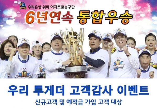 [토요경제=유승열 기자] 우리은행은 여자프로농구 6시즌 연속 통합 우승과 V10 달성을 기념, 26일부터 오는 4월말까지 '우리 투게더 고객 감사 이벤트'를 실시한다.