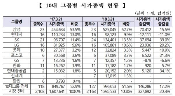 10대 그룹 시가총액이 전체 증시에서 차지하는 비중은 51.5%로 전년보다 1.4% 포인트 하락했다. 전체의 상장기업의 시가총액이 20.4% 증가했기 때문이다.