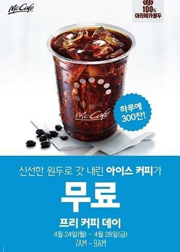 행사 기간 중 매일 오전 7시부터 9시까지 맥도날드를 방문하는 고객 선착순 300명에게 아이스커피를 무료로 제공할 예정이며 맥드라이브 이용 고객도 무료 커피를 받을 수 있다.