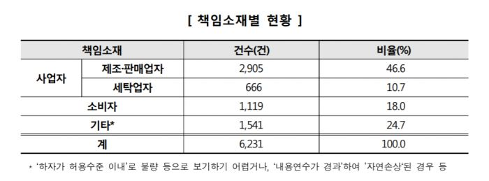 이 중 제품의 품질미흡이나 보관상 문제 등 품질하자로 인한 '제조·판매업자 책임'이 2906건(46.6%)으로 가장 많았다. '책임 소재 정하기 어려움'(24.7%), '소비자 책임'(18%), 세탁업자의 '세탁과실(10.7%)' 등의 순이다.