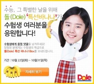 돌코리아의 공식 블로그와 페이스북 페이지를 통해 진행되는 이번 온라인 이벤트는 회사가 수험생의 수능 성공을 기원하며 마련한 이벤트다. 수능을 준비하는 수험생을 위한 응원 댓글을 단 참여자 중 20명을 선정해 회사의 ‘특선(特選) 바나나’ 1박스를 수험생 학급으로 전달한다.