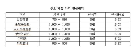 삼양라면은 기존 760원에서 810원으로 6.5% 인상되며 짜짜로니는 850원에서 900원으로 5.9% 오른다.