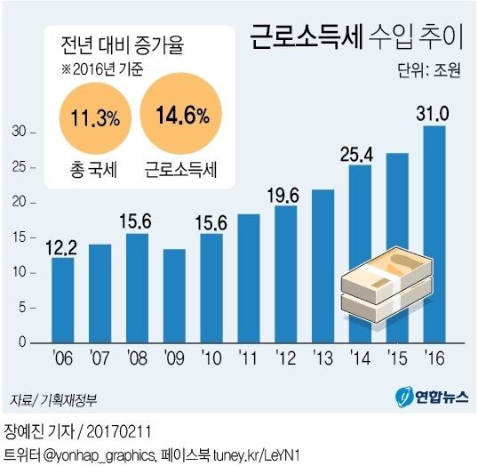 소득세의 경우 부동산 시장 활성화 등으로 양도세가 많이 걷힌 데다 2013년 세법 개정으로 근로소득공제가 세액공제 방식으로 변경돼 중산층 세 부담이 늘어났기 때문이다.
