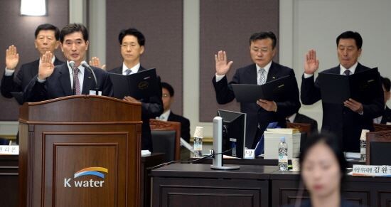 ▲24일 오전 대전 대덕구 연축동 한국수자원공사에서 열린 국회 국토교통위원회 국정감사에서 김완규 한국수자원공사 사장 직무대행이 선서를 하고 있다.