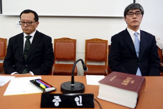 ▲전두환 전 대통령의 장남 전재국씨와 김선용(오른쪽) 코랄리스 인베스트먼트 대표가 21일 오후 서울 종로구 국세청에서 열린 국회 기획재정위원회의 국세청에 대한 국정감사에 증인으로 참석했다.