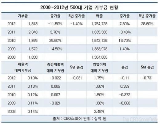 29일 기업경영성과 평가 사이트인 CEO스코어에 따르면 국내 500대 기업의 2008년부터 2012년까지 5년간 기부금 현황 조사결과, 5년 연속 추적이 가능한 민간 기업 381개사의 작년 말 기준 총 기부금은 1조8136억원으로 2008년 1조8385억원에 비해 1.4% 줄었다.