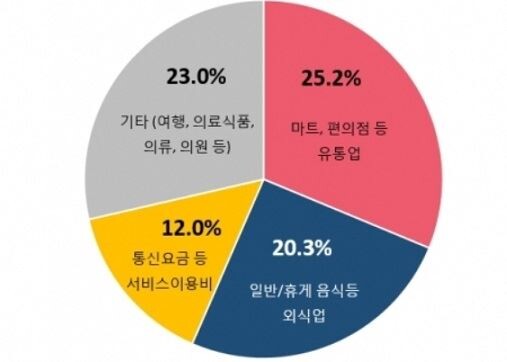 20대 여성 고객이 체크카드를 가장 많이 사용한 곳은 편의점, 마트 등 유통업종(25.2%)인 것으로 나타났다. 이와 함께 일반 음식점 등 외식업(20.3%), 통신요금 납부 등 서비스 이용비(12%)가 뒤를 이었다.