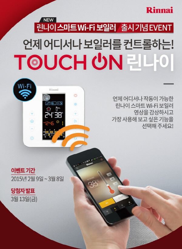 [토요경제=송현섭 기자] 린나이코리아가 6일 스마트폰을 통해 원격제어가 가능한 '스마트 와이파이(Wi-Fi) 보일러' 출시를 기념, 오는 9일부터 3월8일까지 경품행사를 진행한다고 밝혔다.