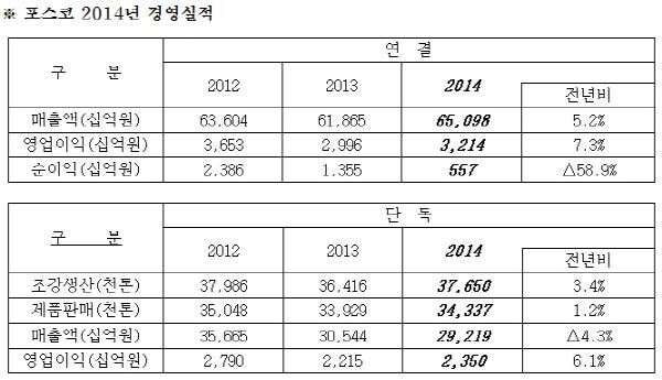 다만 당기순이익은 세무조사와 관련된 손실 등 일시적 영업외 손실이 반영됨에 따라 5567억원을 기록했으며 포스코 단독으로는 매출액 29조2189억원, 영업이익은 2조3500억원이다. 회사 관계자는 "지난해 권오준 회장이 취임이후 오는 2016년 연결기준 EBITDA 8조5000억원, Debt/EBITDA 3배 달성을 목표로 철강 본원 경쟁력 강화를 추진이 주효했다"며 "신사업의 선택과 집중, 재무구조 개선 및 경영인프라 쇄신에 맞춘 경영활동이 성과를 거두고 있다"고 설명했다.
