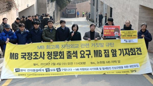▲ 지난 4일 서울 논현동 이명박 전 대통령 사저 인근에서 열린 'MB자서전 자원외교 관련 거짓말 규탄, 국정조사 청문회 출석 요구' 회견에서 김제남 정의당 의원이 발언하고 있다.