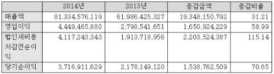 ▲ 2014년 녹십자엠에스 경영실적. ※ 상기 실적내용은 한국채택국제회계기준(K-IFRS)에 따라 작성된 개별재무제표 기준의 잠정 영업실적입니다.