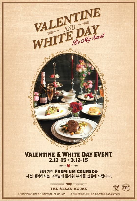 오는 2월 12일부터 15일, 그리고 3월 12일부터 15일까지 총 8일간 특별히 선보이는 프리미엄 코스는 미국산 프라임 립아이 또는 뉴욕 스트립 스테이크를 메인으로 하며, 플라워 부케를 제공하는 등 연인들을 위한 로맨틱한 이벤트도 준비되어 있다. 이번 프로모션 메뉴를 사전 예약하는 고객들께는 플라워 부케와 카드를 무료로 증정한다. 프로모션 기간 중 스페셜 데이를 위한 프리미엄 코스 판매 기간을 제외한 나머지 기간에 판매 예정인 코스 주문 고객에게는 특별한 글라스 와인이 제공된다.