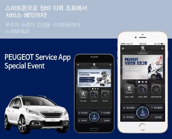 푸조 서비스 애플리케이션은 지난해 7월 안드로이드용 버전과 지난 9일 아이폰용 애플리케이션을 공식 출시하였다. 푸조 고객들은 이를 통해 서비스센터 찾기, 정비 이력 조회, 실시간 서비스 예약, 차량 조작법을 비롯해 프로모션, 캠페인, 신차 정보 등 푸조의 다양한 소식을 손쉽고 빠르게 접할 수 있다.
