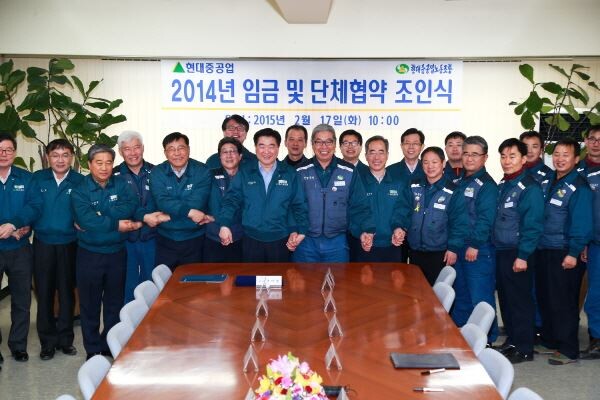 이와 관련 현대중공업은 지난 17일 울산 본사 생산1관에서 권오갑 사장과 정병모 노조위원장 등이 참석한 가운데 '2014년 임금 및 단체협약 조인식'을 가졌다고 18일 밝혔다.