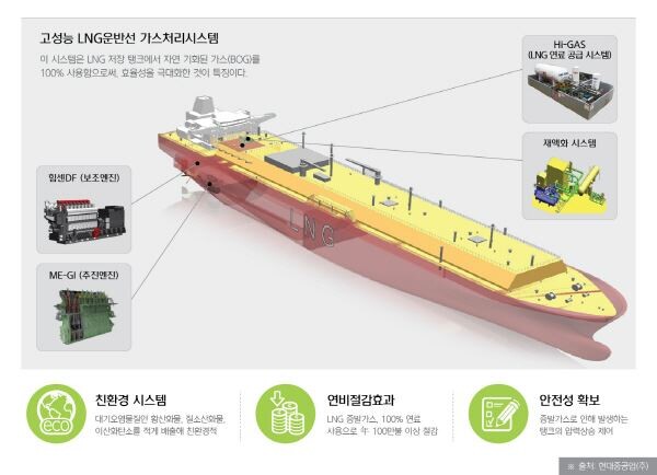 특히 이 시스템은 LNG 저장탱크에서 자연 기화된 가스(BOG)를 100% 활용해 효율성을 극대화한 것이 특징이다. 현대중공업 관계자는 "증발가스 고압 압축기와 LNG 연료공급시스템(HI-GAS)이 각각 독립적으로 운영된다"며 "각 시스템이 정상적으로 운영되지 않더라도 증발가스를 100% 처리할 수 있는 것이 강점"이라고 설명했다.