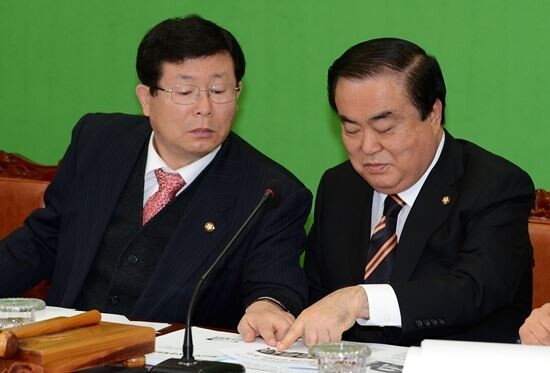 문희상(오른쪽) 민주통합당 비상대책위원장이 22일 오전 서울 여의도 국회 당 대표실에서 열린 비대위원회의에서 설훈(왼쪽) 비대위원과 함께 신문기사를 살펴보고 있다.(사진=뉴시스)
