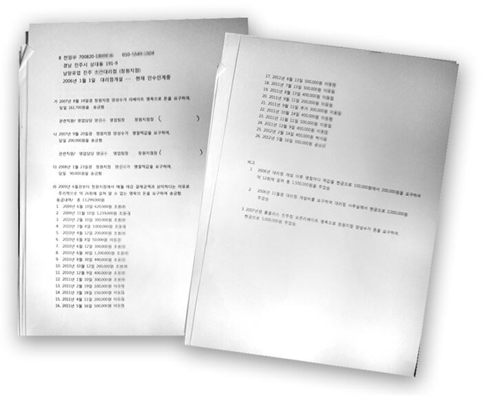 세부 내용을 살펴보면 남양유업 창원지점은 가맹점주들에게서 자주 ‘떡값’을 받아간 것으로 보인다. 문서에는 ‘2007년 8월 14일경 창원지점 양○○가 리베이트 명목으로 돈을 요구하여, 당일 161,700원을 송금함’, ‘2007년 9월 20일경 창원지점 양○○가 명절떡값을 요구하여, 당일 200,000원을 송금함’, ‘2009년 6월경부터 창원지점에서 매월 마감 결제금액과 상이하다는 이유로 주기적으로 약 26회에 걸쳐 알 수 없는 명목의 돈을 요구하여 송금함’이란 문구가 적혀 있다. 이어 상세한 입금 내역까지 기록돼 있다. 26회에 걸친 송금 액수를 모두 합치면 무려 1329만9000원에 달한다.