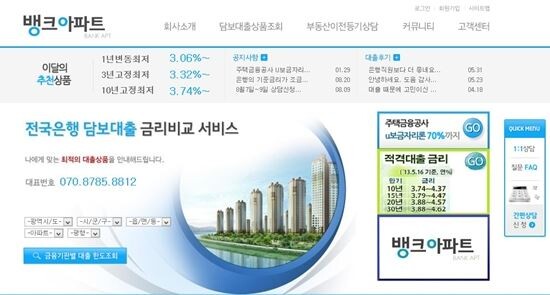 한편, 뱅크아파트(http://bankapt.com)에서는 전 금융권(은행, 보험사, 농협, 수협, 새마을, 신협, 저축은행, 캐피탈 등)에서 제공하는 주택 담보대출, 아파트 담보대출, 빌라 담보대출, 전세자금·보증금 담보대출 아파트 후순위 담보대출 등의 금리와 조건을 무료로 비교해주고, 은행 담당자와 고객을 1:1로 연결해주기 때문에 고객신뢰도도 높고 사이트에 제공되는 이자계산기를 통해 한 달에 납입하는 이자와 원금을 쉽게 확인해 볼 수 있다.