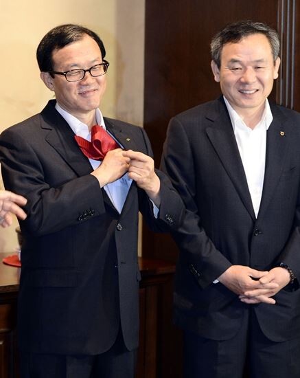 이순우 우리금융지주 신임회장겸 은행장이 14일 오전 서울 중구 한국은행에서 열린 금융협의회에 참석해 넥타이를 풀고 있다. (사진=뉴시스)