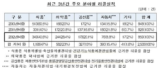 리콜이 주로 이뤄진 분야를 보면 식품이 349건(40.6%), 의약품이 244건(28.4%), 공산품이 173건(20.1%), 자동차가 76건(8.8%)으로 전체의 98% 이상을 차지했다.