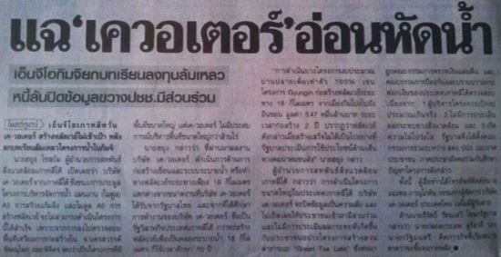 태국 일간지 ‘타이 포스트’는 지난달 26일 염 총장의 발표를 인용, ‘빚더미 K-water와 물관리 사업의 진실’이라는 제목으로 “수공은 소규모 사업수행 경험 밖에 없어 태국 물관리 사업 수행능력이 없고 부채도 많은 부실기업이다. 태국정부와 이면(밀실) 계약 가능성이 있다”고 보도했다.