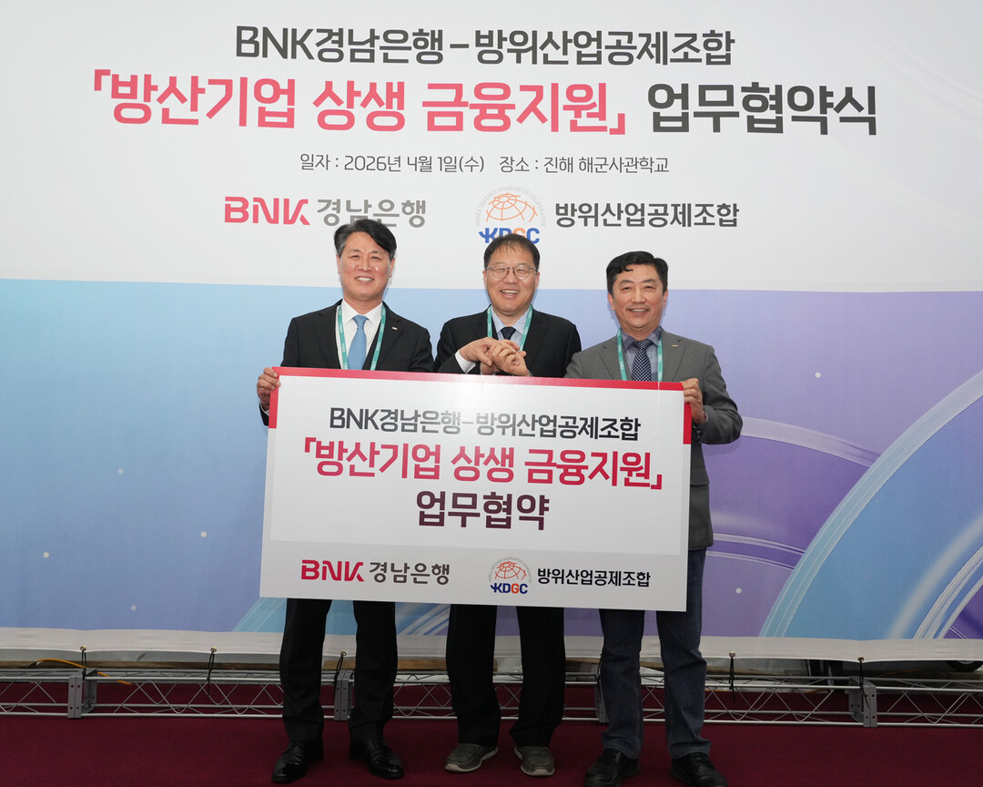[토요경제 = 김연수 기자] BNK경남은행이 지난 1일 ‘2026 이순신방위산업전’이 열리는 경남 진해 해군사관학교에서 방위산업공제조합과 ‘방산기업 상생 금융지원을 위한 업무협약’을 체결했다.