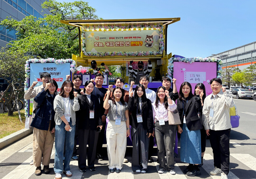 이번 행사에는 은행 차세대 리더 그룹인 ‘BNK YES! LEADER(예스리더)’와 전략기획부 직원 20여명이 참여해 한화엔진 임직원들에게 커피차를 통해 음료를 제공하며 감사의 뜻을 전했다.