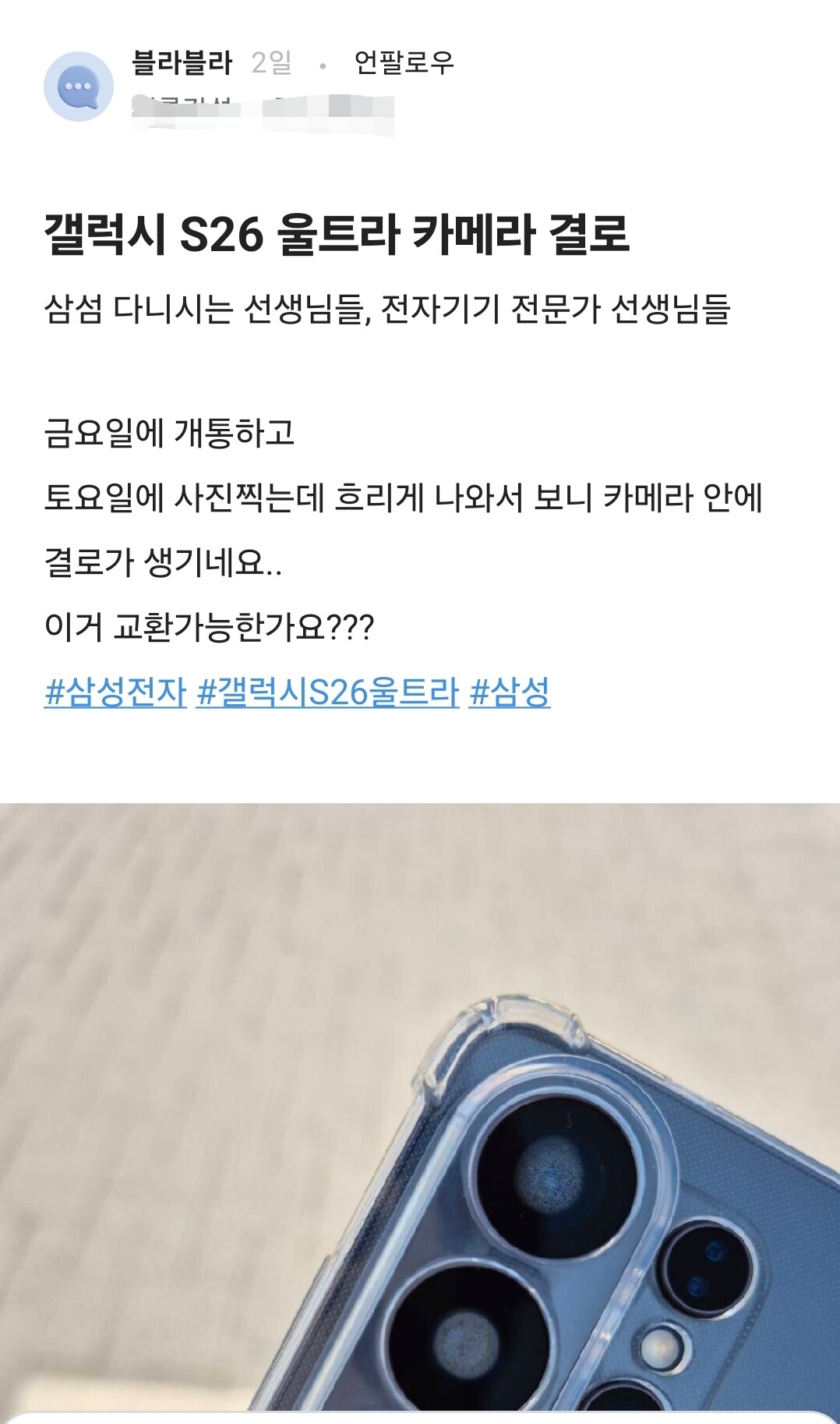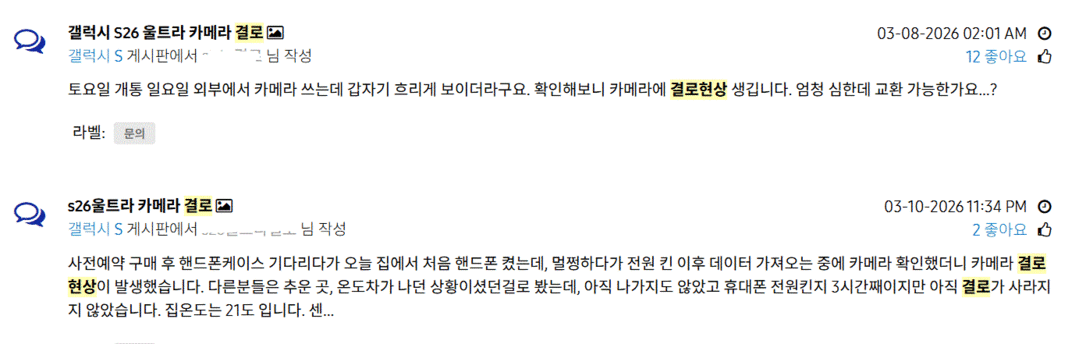 특히 갤럭시 S26 울트라는 삼성전자가 글로벌 스마트폰 시장 경쟁력 강화를 위해 내놓은 전략 모델인 만큼 카메라 품질과 직결된 결로 논란이 향후 제품 평가에 어떤 영향을 미칠지 주목된다.