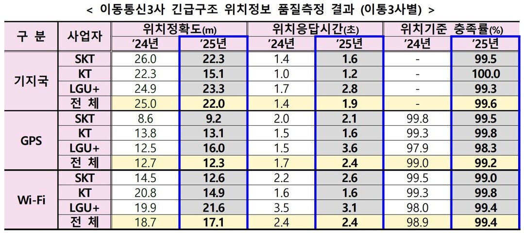 방미통위는 ‘2025년 긴급구조 위치정보 품질 측정’ 결과를 공개하고 이통 3사의 위치정확도와 위치기준 충족률이 전년보다 향상됐다고 21일 밝혔다.