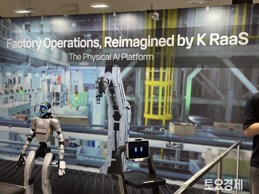 피지컬 AI 공간에서는 ‘K RaaS(KT Robot as a Service·서비스형 로봇)’를 통해 서로 다른 종류의 로봇이 협업하는 시연이 진행됐다. 로봇 시연이 시작되자 주변 관람객들이 휴대폰을 꺼내 촬영하는 등 동작을 살폈다.