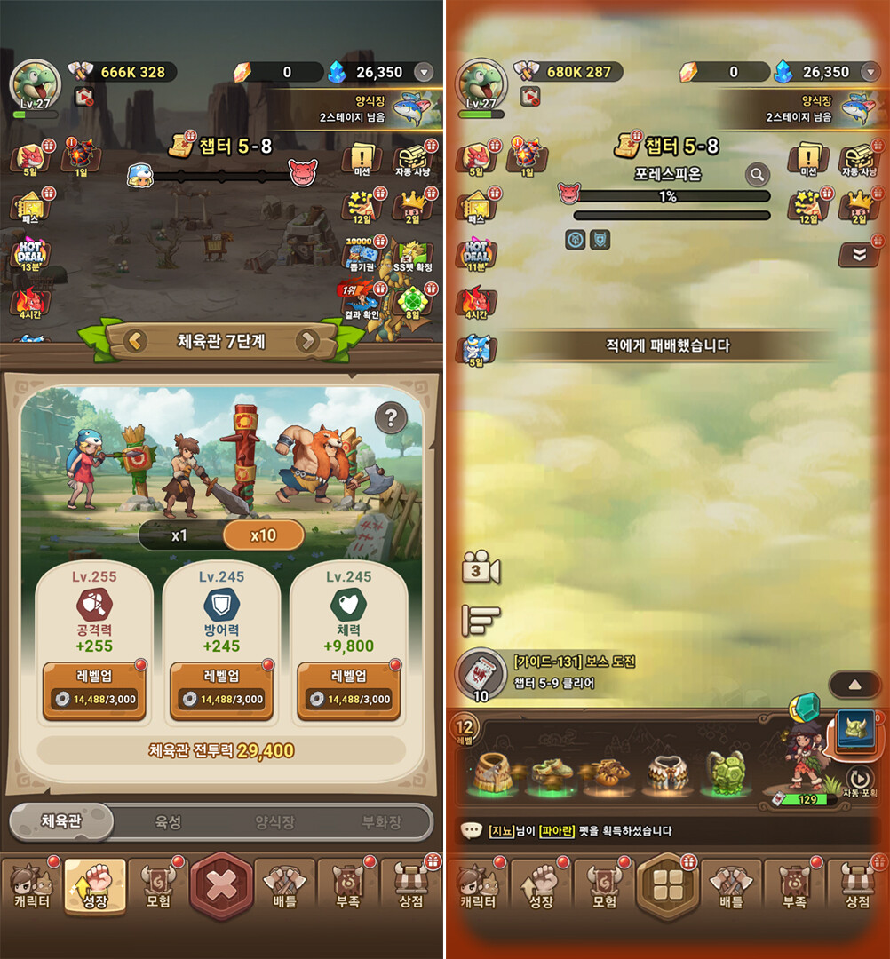 다만 완전히 방치할 수 있는 구조는 아니다. 레벨업이나 강화에 신경을 쓰지 않으면 보스 구간에서 전투가 아슬아슬하게 이어지거나 패배하는 경우도 발생했다. 자동 전투 중심 구조에 꾸준한 성장 관리가 요구되는 방식이다.